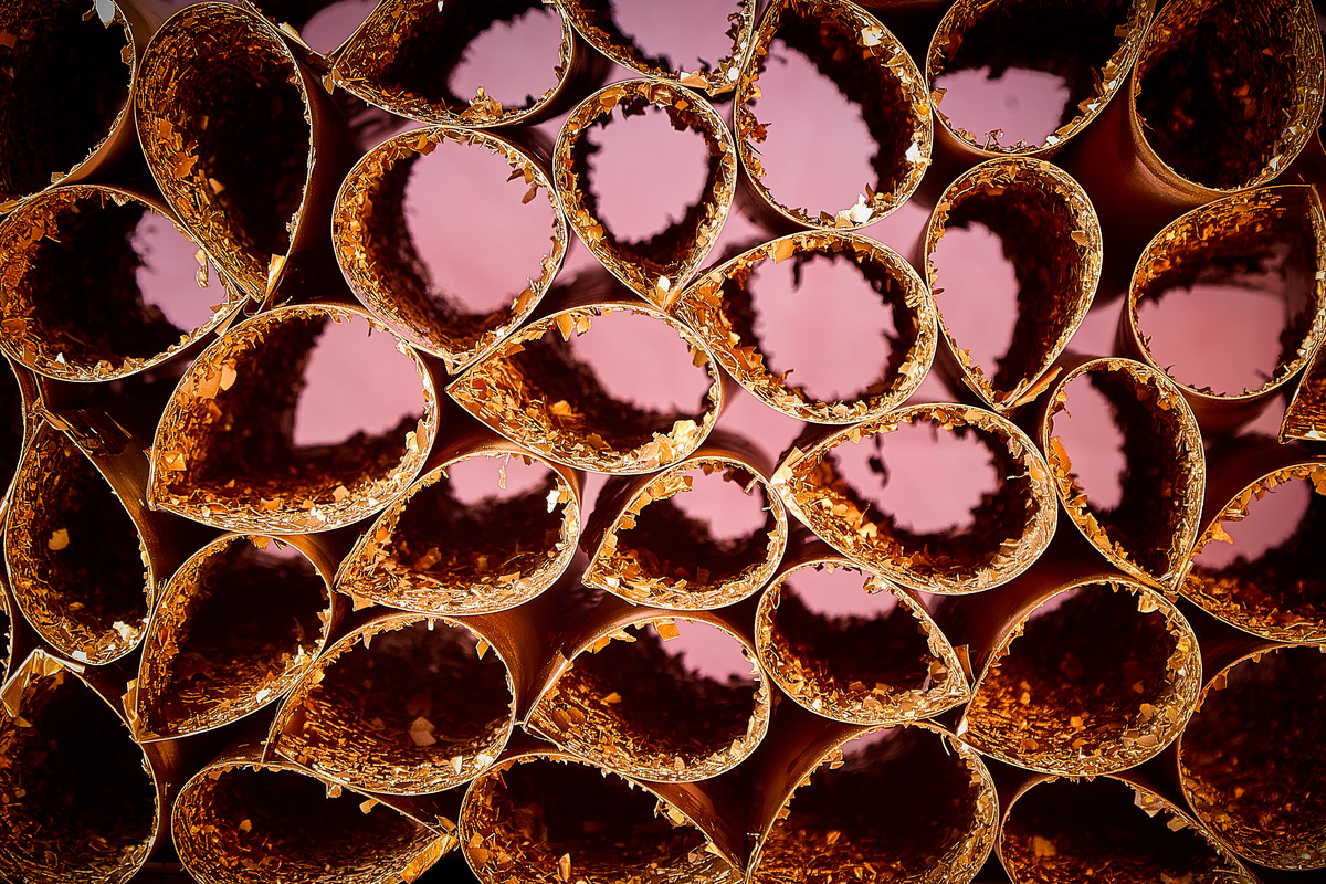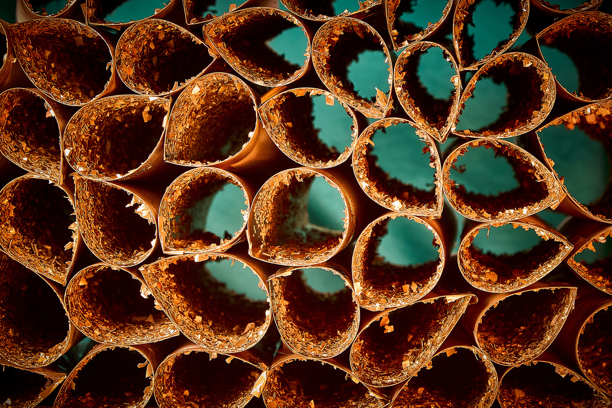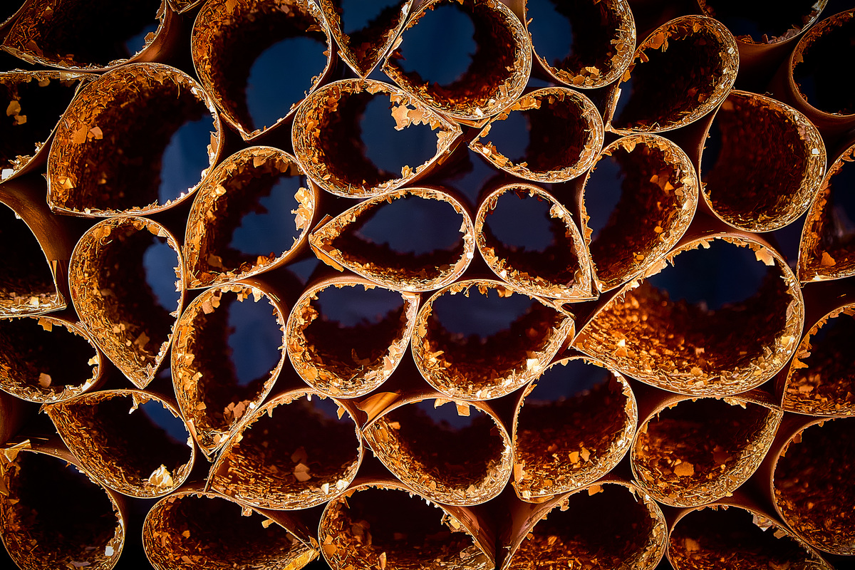 Diferentemente de outras séries, aqui não há diálogo cromático entre o interior dos tubos e o plano de fundo. A superfície é ríspida ao olhar. O interior dos tubos não devolve luz. A cor do fundo não acompanha as paredes; é como se não conseguisse aderir à matéria.