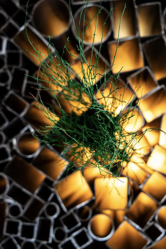 A série Raízes apresenta o contraste entre a geometria rígida dos tubos metálicos e a organicidade das raízes, que rompem a estrutura e criam novos caminhos.